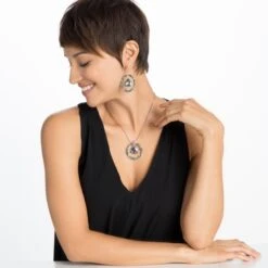 Our designer fell in love with this soft triangular silhouette from fine quality crystals, using it as the centerpiece of her design. In “Blue Shade,” it has 49 facets. The overall look of the piece is a mix of vintage and contemporary styles. Reversible, too.