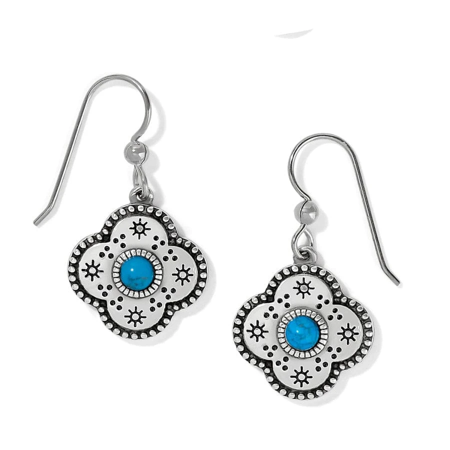 Etched in southwest symbolism and accented with turquoise-dyed howlite stones that showcase the breathtaking inclusions of real turquoise, these earrings are made to pair with your silver, turquoise and leather jewelry.